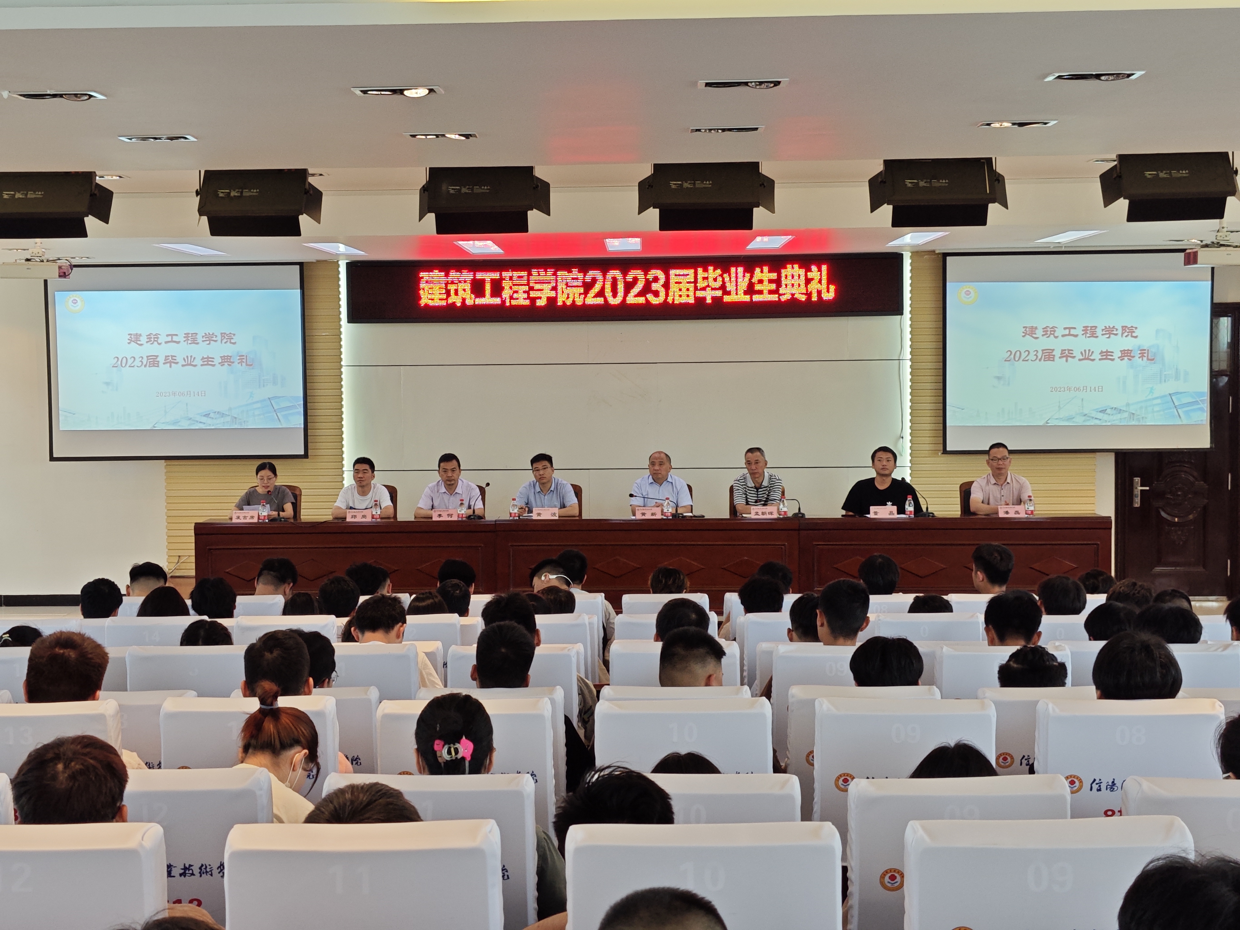 典礼上,黄波宣读了建工学院2023届省级、校级优秀毕业生获得者名单,辅导员代表王文娟老师和毕业生代表余卫华同学分别上台做了发言。