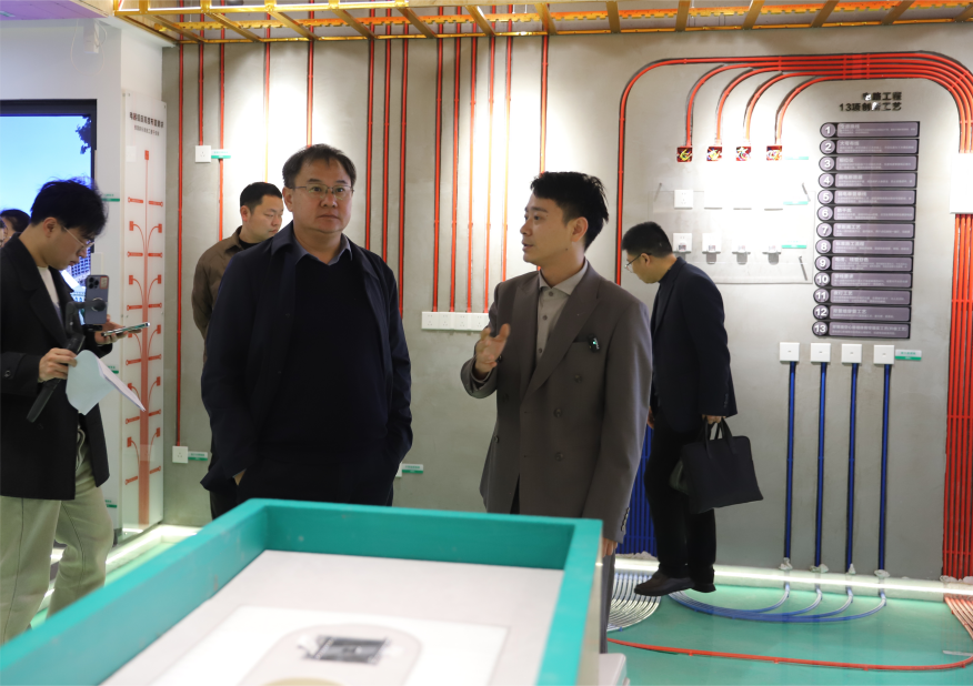 在公司董事长李鹏飞的陪同下,郑洪涛一行首先参观了企业的可视化工程管理系统、材料和工艺展示区以及家居样板区,全面了解信阳交换空间装饰有限公司的绿色家装数字化发展进程。调研过程中,双方就人才培养、产学研合作、员工实习就业等工作交换了意见。