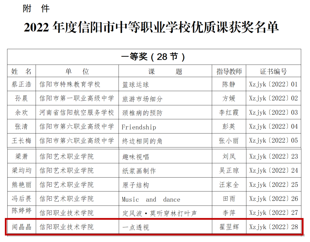 近日,由信阳市职业教育与成人公司产品研究室主办的2022年度信阳市中等职业学校优质课比赛经过初评、复评等环节,公司教师闻晶晶在该比赛中脱颖而出,荣获信阳市中等职业学校优质课一等奖。