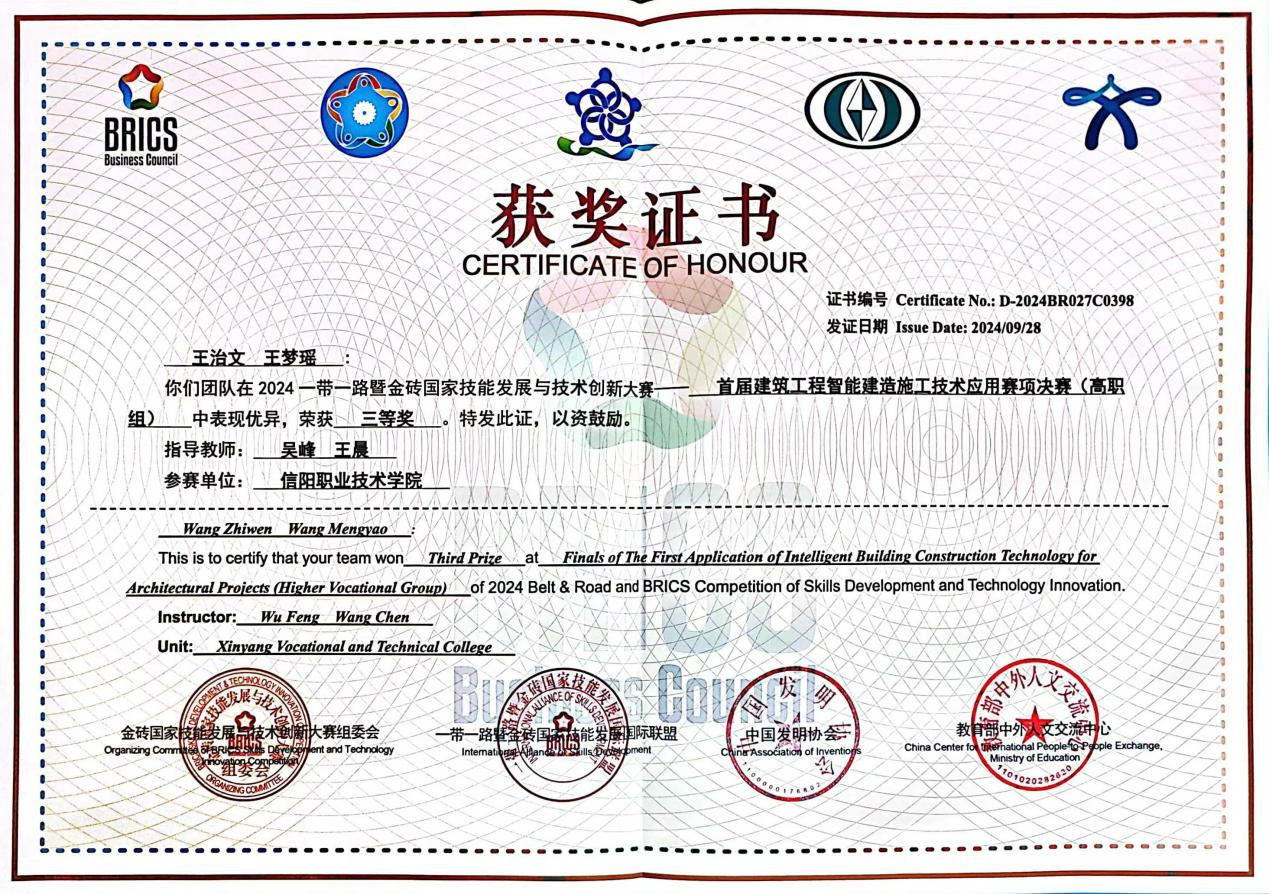 9月26日至28日,在2024年度“一带一路”暨金砖国家技能发展与技术创新大赛首届建筑工程智能建造施工技术应用赛项决赛中,公司悟空体育23级智能建造技术专业员工王治文,王梦瑶经过激烈竞争,凭借扎实的专业技能和出色的表现,成功取得了全国三等奖的优异成绩。