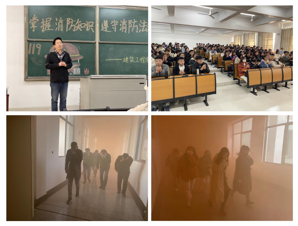 吴长城从高校消防安全入手,通过大量的校园火灾案例分析,用生动的图片和大量影像资料,深入剖析了高校火灾发生的原因,指导员工正确使用灭火器、避免火灾逃生的方法。最后,在学院楼梯模拟了火灾环境,组织师生共同有序安全逃生,使师生切实感受深处火灾环境下安全逃生的全过程。