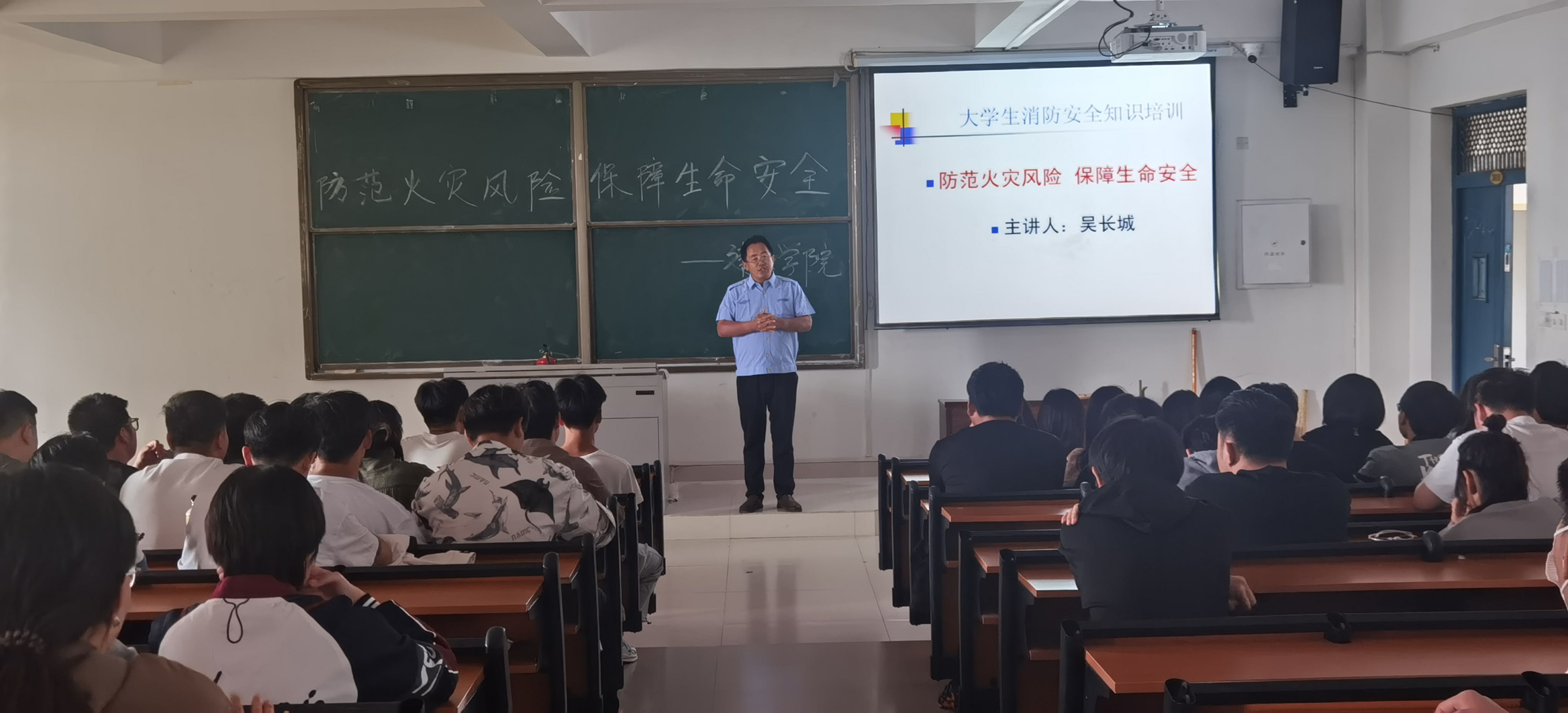 吴长城向到场师生宣讲了消防安全知识,用大量详实的案例诠释了火灾的严重后果,并现场模拟了如何正确使用灭火器。最后,在吴长城的指导下,广大师生在教学楼内开展了火灾逃生演练。