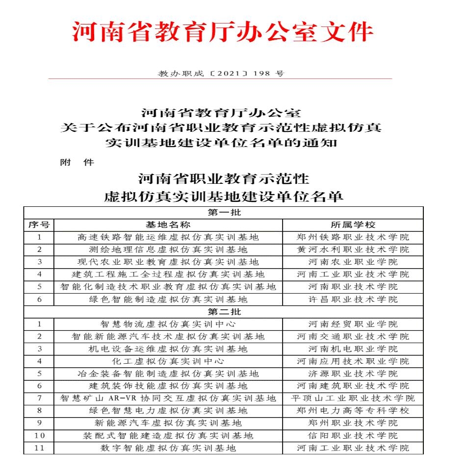 根据教育部《关于开展职业教育示范性虚拟仿真实训基地建设的通知》(教职成司函[2020]26号)和《河南省教育厅办公室关于开展河南省职业教育示范性虚拟仿真实训基地建设工作的通知》(教职成函[2021]360号)的要求,从2021年6月底开始悟空体育积极组织相关专业老师,依托公司数字化实训中心建设,同时根据公司专业特色并结合当下建筑市场趋势,认真准备申报材料,最终按照文件要求完成申报工作。省教育厅通过组织专家进行资料审查,综合评审,最终确定公司装配式智能建造虚拟仿真实训基地参加河南省职业教育示范性虚拟仿真实训基地建设工作。