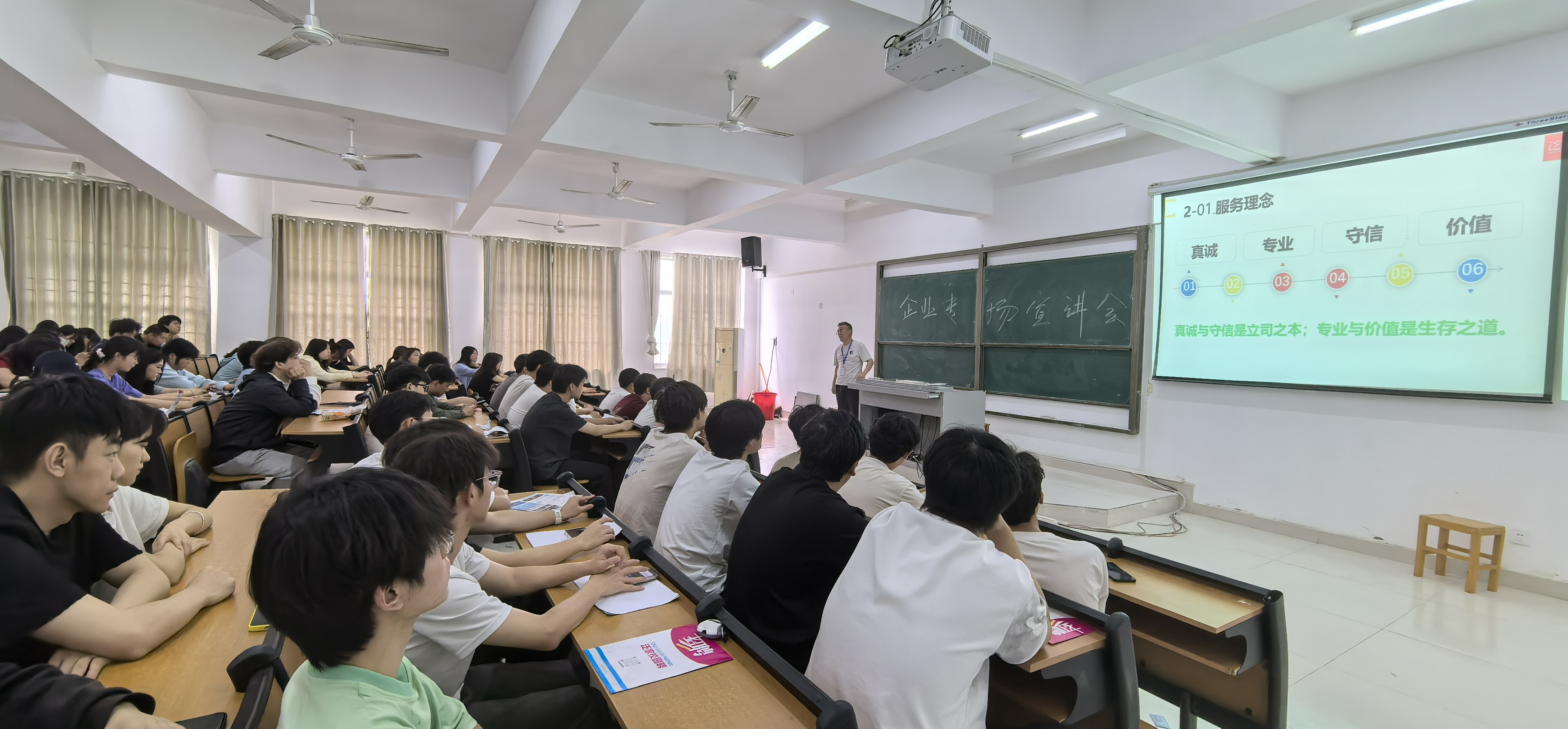 当天下午,学院在教学楼组织开展了专场招聘会。华高科技(苏州)有限公司、上海泛家装饰有限公司、太平洋房地产经纪有限公司和浙江舜宇集团有限公司4家企业,依次通过 PPT 展示、视频播放等形式,向员工介绍企业的整体情况、薪资待遇、工作环境等内容,并现场解答同学们的疑问。招聘会后,到场员工和企业代表通过QQ群、微信群互留联系方式,并确定后续的网络面试流程。